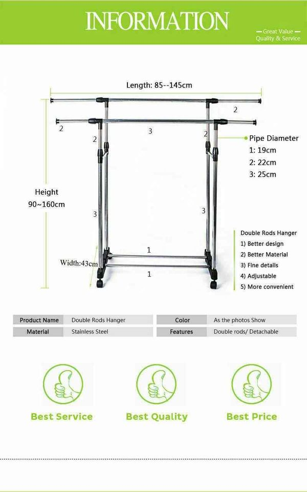 Clothes Rack Garment Holder Double Stainless Shelf Hanger Adjustable Coat