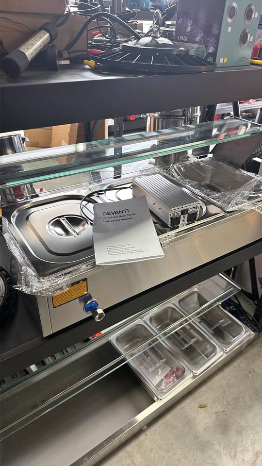 This item is a new 3-tray Bain Marie, designed for keeping food warm and ready to serve in commercial settings such as restaurants, cafés, catering businesses, and buffets.