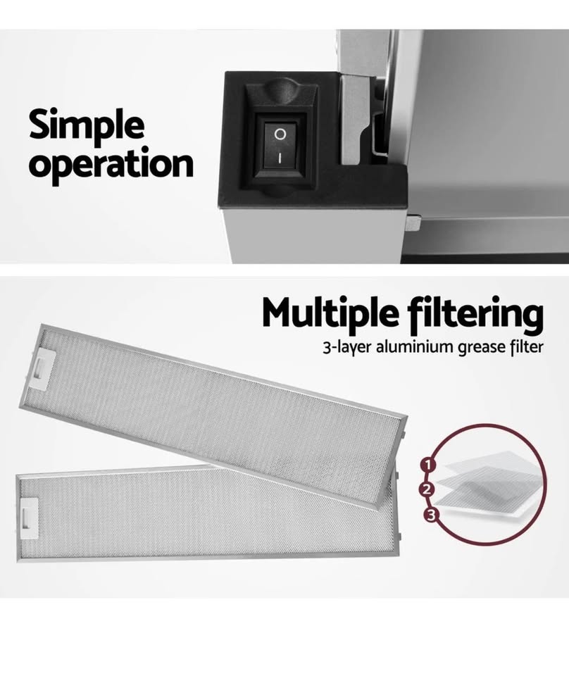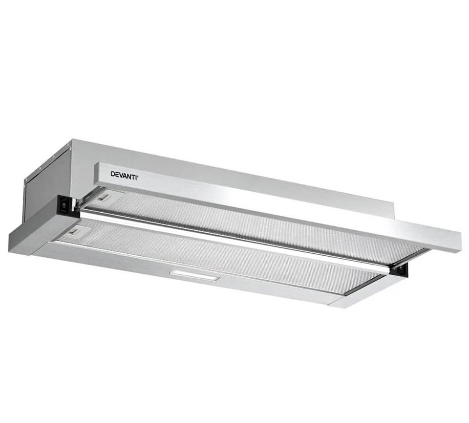 Modern and space-saving 900mm slide out range hood, perfect for keeping your kitchen fresh, clean, and free from smoke, grease, and cooking odors. Ideal for most standard cooktops and kitchens.