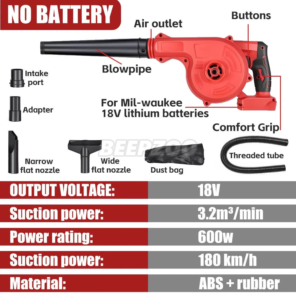 【for Milwaukee 18V Compatibility】Our cordless leaf blower is match for Milwaukee 18V large-capacity batteries, Compatible with Milwaukee 18V M18 MAX lithium-ion batteries.