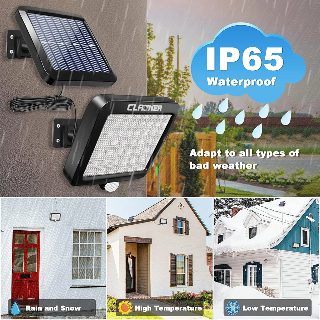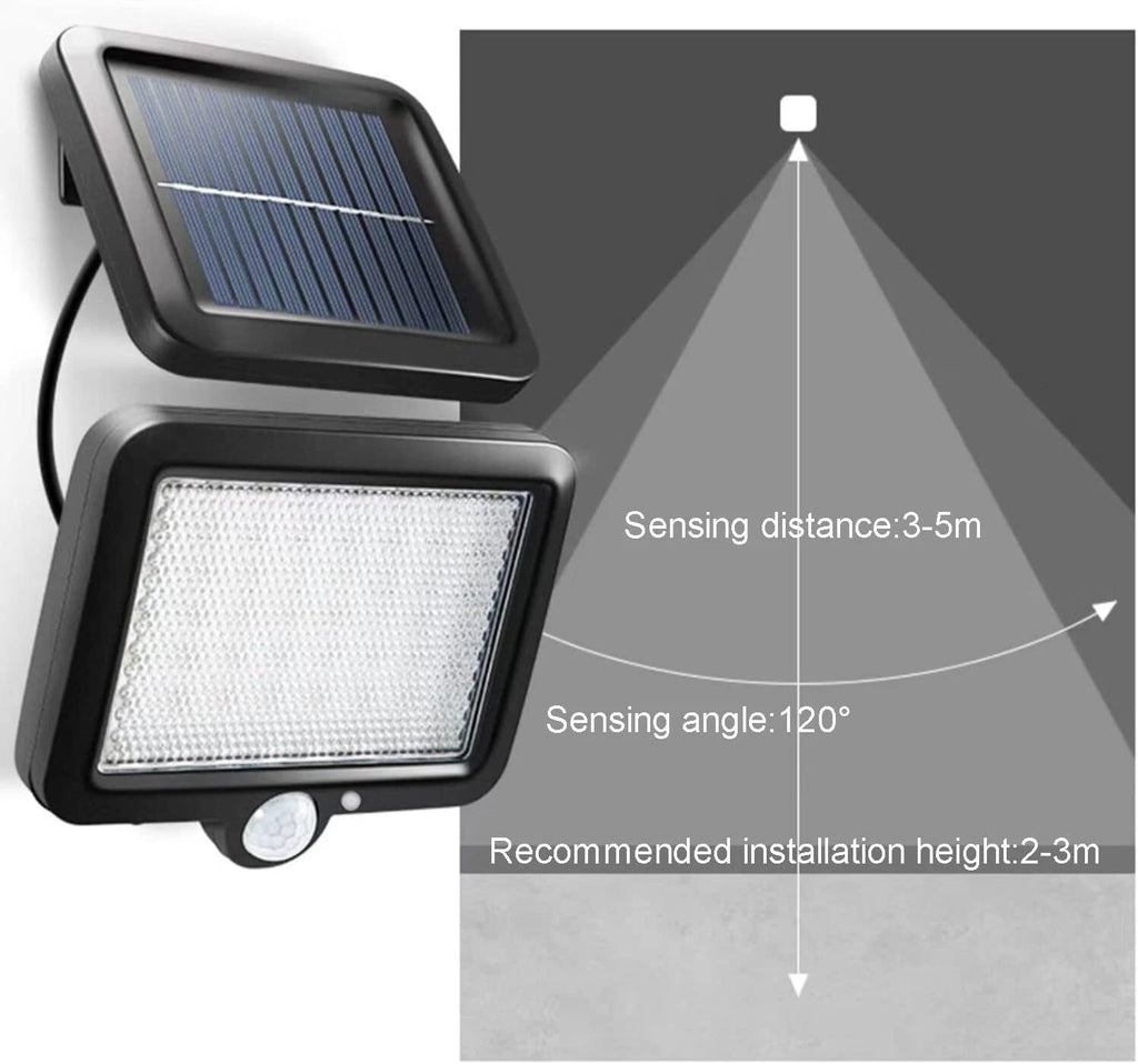 Solar panel: 13cm * 11.5cm * 1.5cm Luminous flux: 3000LM / 6000K Lithium battery: 3.7V / 1200mAh Solar panel: 5.5V / 180mAh Protection: IP65 Cable length: 5M LED: 56 pieces Switching distance: 5M |